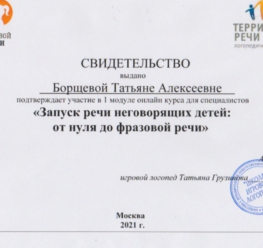 - 2021г Авторский курс Татьяны Грузиновой и Елизаветы Гуриной «Запуск речи неговорящих детей: от нуля до фразовой речи». Логопедический центр "Территория речи"