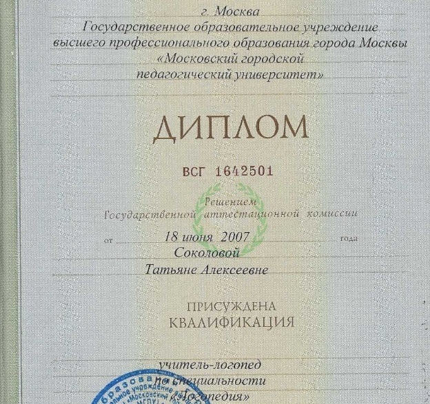 - 2007г Московский городской педагогический университет. Факультет Специальной педагогики и специальной психологии, Учитель-логопед.