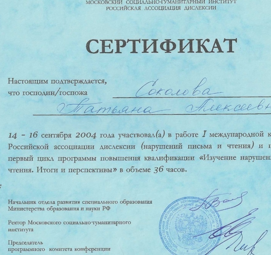 - 2007г Московский городской педагогический университет. Факультет Специальной педагогики и специальной психологии, Учитель-логопед.