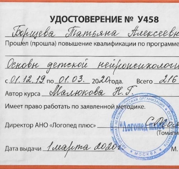 Хочу выразить слова огромной Благодарности нашему любимому логопеду-дефектологу Татьяне Алексеевне!Мы начали плотно заниматься в 6 лет, пришли с СДВГ и дизартрией.До Татьяны Алексеевны было много попыток, но не получалось у логопедов найти подход, заинтересовать и усадить, чтоб ребенок позволил еще и массаж делать во рту.Непросто было в первое время, усидеть не мог, повторять не хотел, язык не слушался, но благодаря профессионализму, душевной теплоте, супер-интересным занятиям - процесс пошел!.Мы стали выговаривать все звуки, язык начал слушаться, а ведь при дизартрии он в сильном тонусе и плохо двигается. Сын с гордостью сейчас говорит: «Это Татьяна меня научила так красиво говорить!».На занятия идет с удовольствием, сам видит результат! Помимо коррекции звуков, мы занимаемся работой с фонематическим слухом, грамматикой, лексикой и много чем, учитывая наше СДВГ, мы здесь тоже успели получить большой пробел.Планируем заниматься дальше, не останавливаться на достигнутом!С благодарностью, мама Димы.