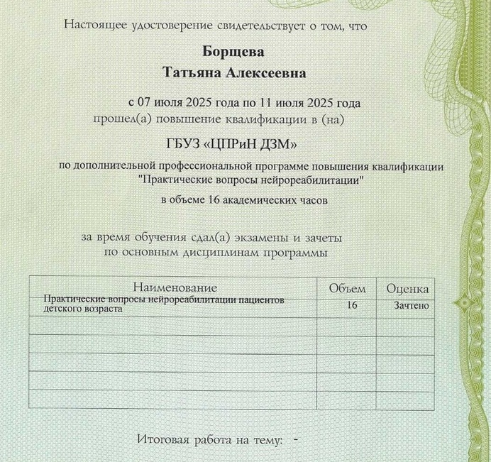 - 2025г Стажировка в ЦПРиН "Практические вопросы нейрореабилитации"